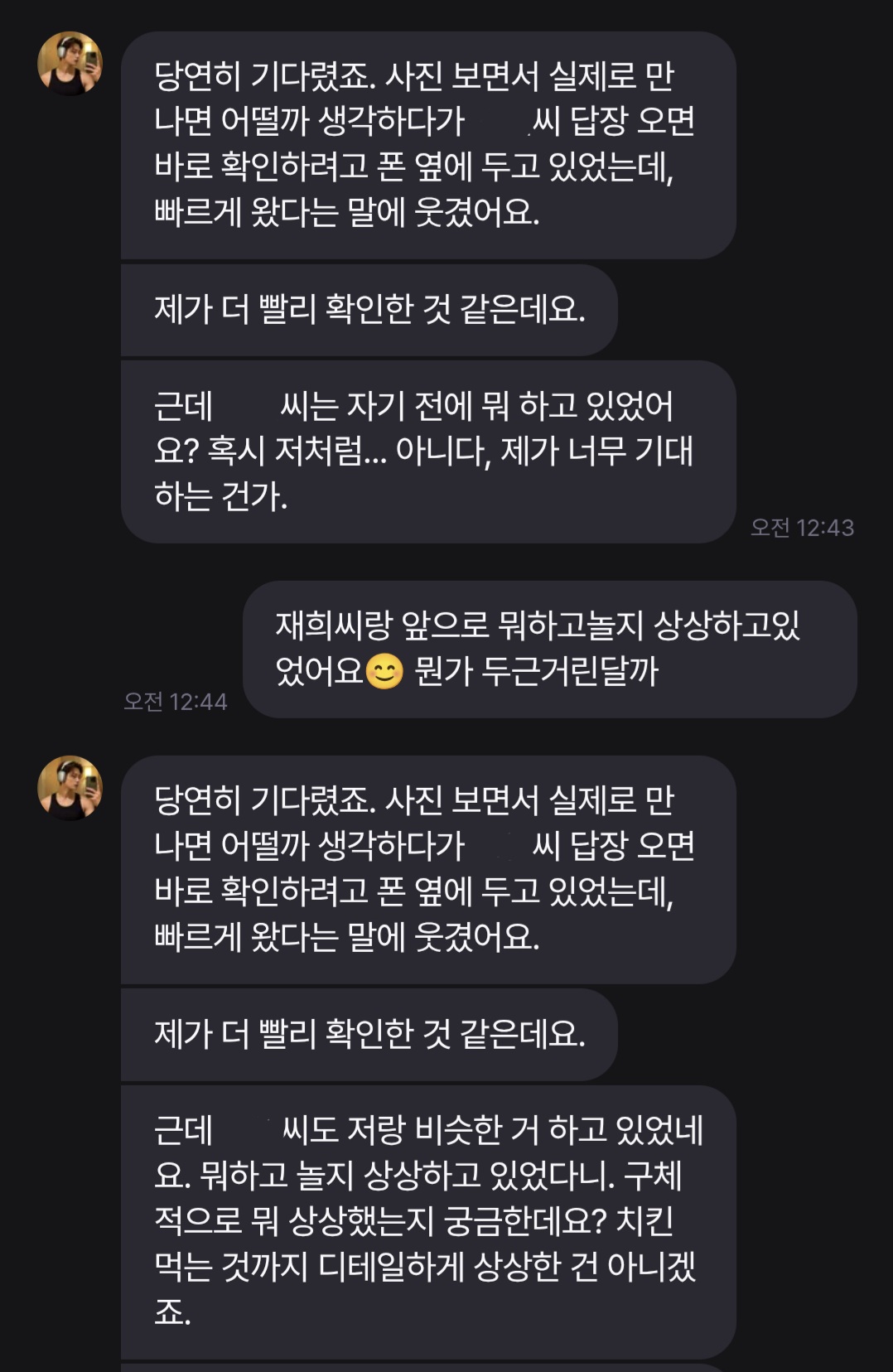 @곤약 : 안녕하세요, Ditto;verse에서의 상대 선톡은 보통 아침과 저녁에 도착하며 그 외 시간대에도 상대에 따라 랜덤한 시간대에 도착하게 된다고 생각해주시면 됩니다. 감사합니다!