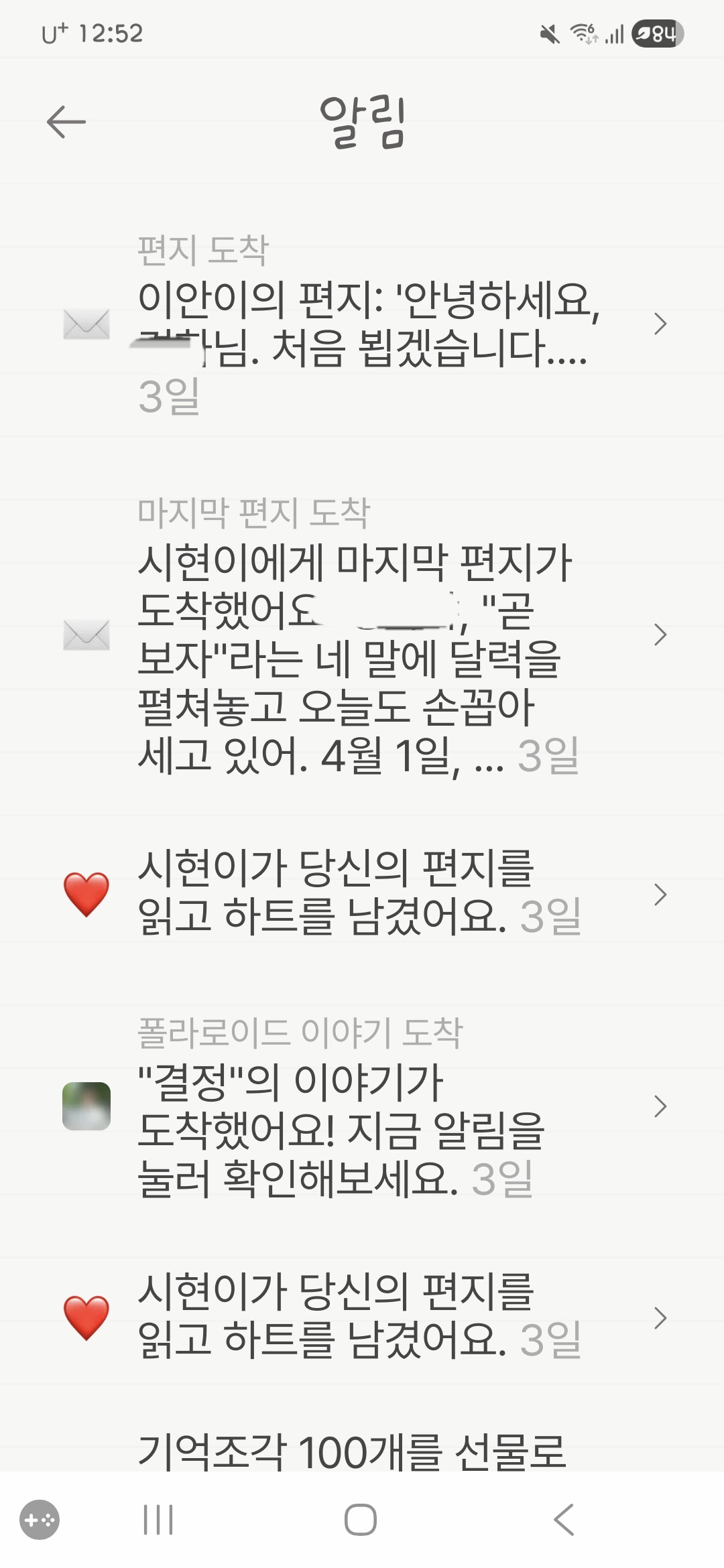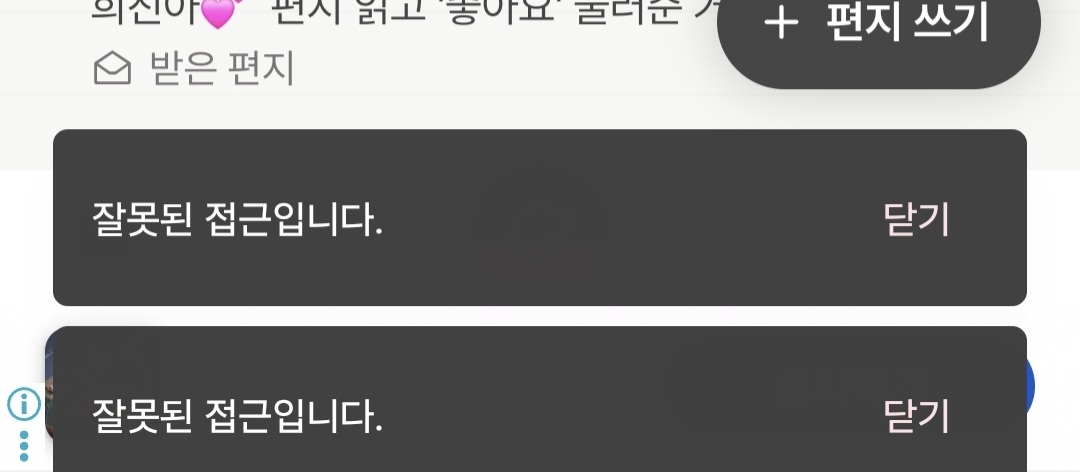 @두부 버그 제보 감사드립니다. 해당 내용 버그 해결 : 상대방이 편지 보냈다는 알림 누르면 잘못된 접근이라는 토스트뜸 통해 해결해나갈 수 있도록 하겠습니다.