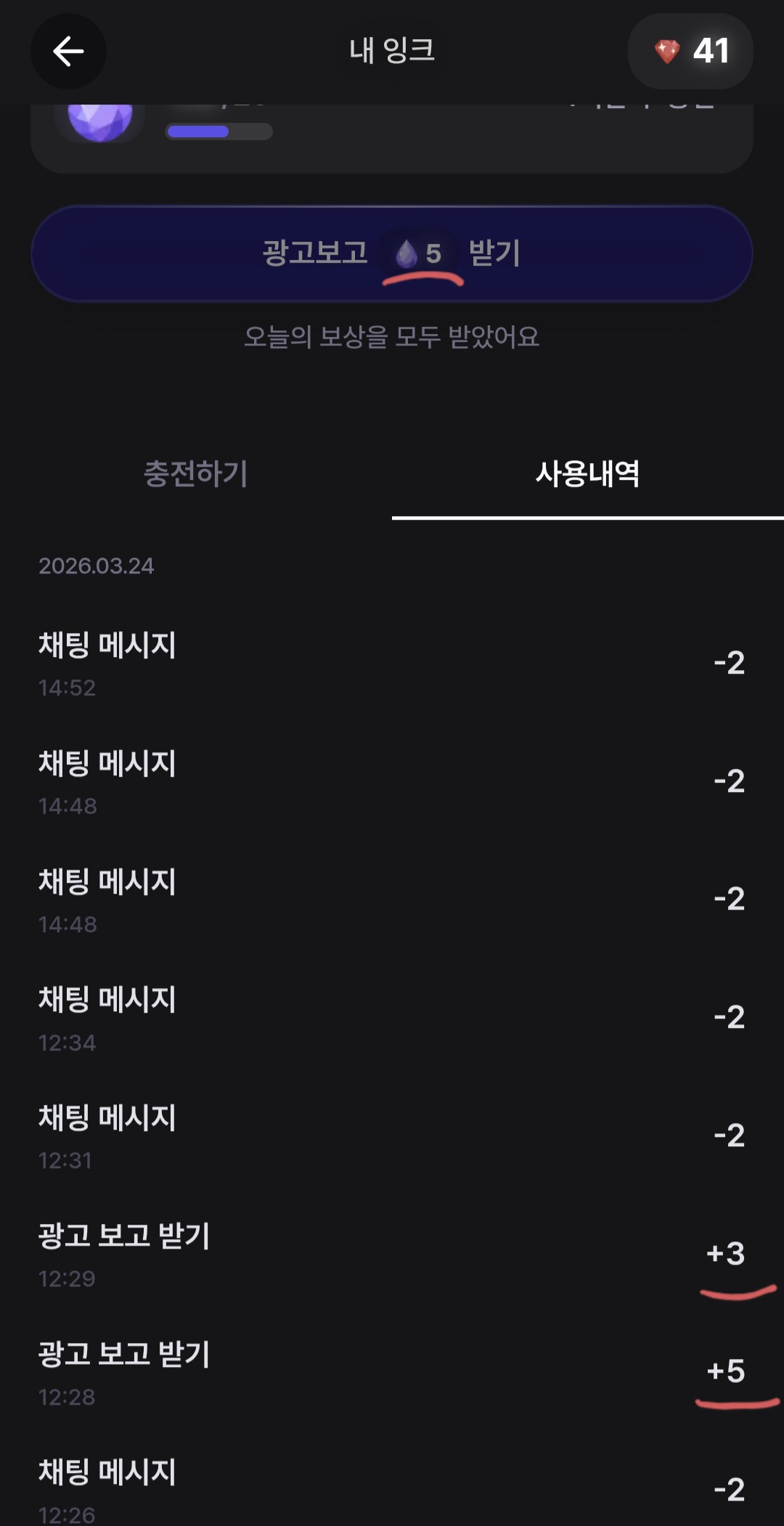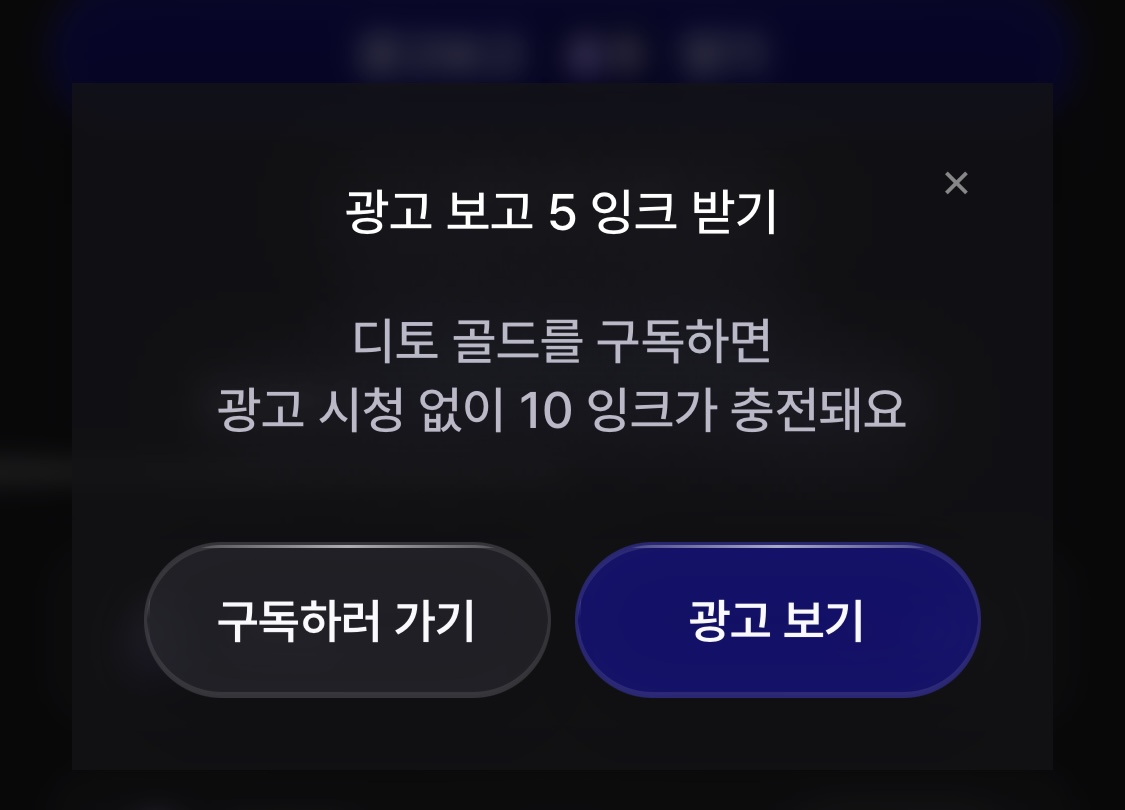 @곤약 : 현재 디토 골드 유저는 자동 충전량이 2배이며, 광고 또한 선택적으로 보고 추가로 잉크를 받을 수 있으나, UX/UI가 많이 헷갈리게 구성된 상황이에요. 해당 내용 헷갈리지 않게 개선할 수 있도록 하겠습니다.