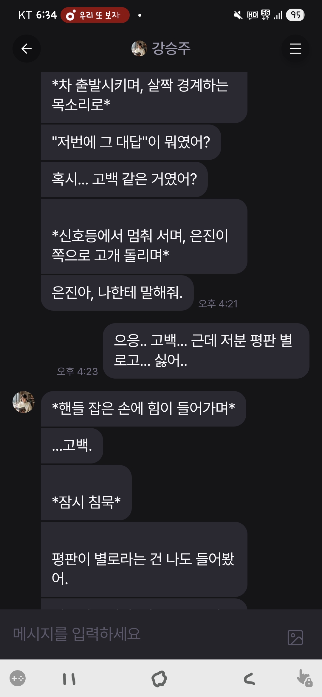 @두부 : 버그 제보 감사드립니다. 채팅 내용 중 시스템 메시지가 섞이는 오류는 AI 지능에 따라 확률적으로 발생하여 쉽게 해결할 수 있는 문제는 아니나, 지속적으로 모니터링하고 개선하도록 하겠습니다.